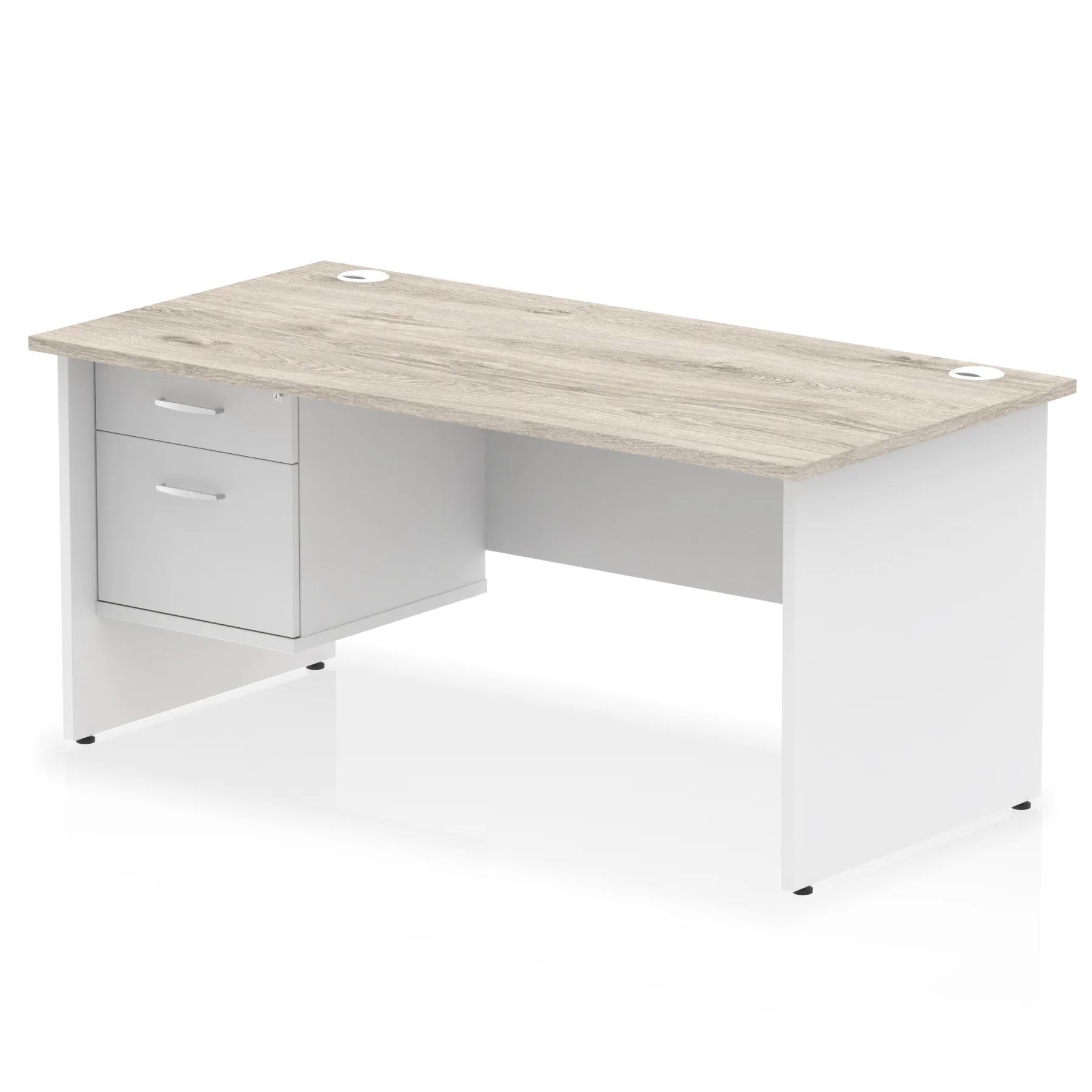 • Impulse contract 1600 wide desk • 25mm tops • Heat resistant beech melamine finish • 18mm modesty panel • 2mm protective abs edging • Matching wood panel end legs • 2 cable ports • Height adjustable feet • Steel to steel fixings • 2 modesty panel slots • Deep set modesty panel (5”) allows for compatibility of most screen clamp fittings • Fixed pedestal