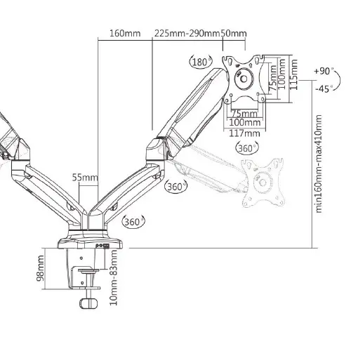 • Tilt up/down 180 degrees, free swivel left/right 360 degrees, 360 degrees rotation, mount the monitor in landscape or portrait orientation
