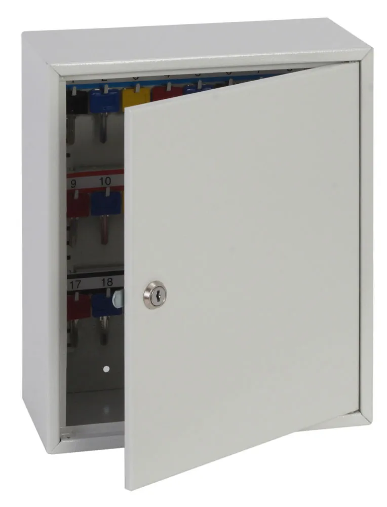 NO. OF KEY HOOKS – 24 | SPECIAL FEATURES – Comes complete with adjustable hook bars, key tabs, key rings, number labels to suit the hook bars and removable control indexes | FIXING – The cabinet has pre-drilled fixing holes for wall mounting and bolts supplied | FINISH – Finished in a high quality durable powder coated finish